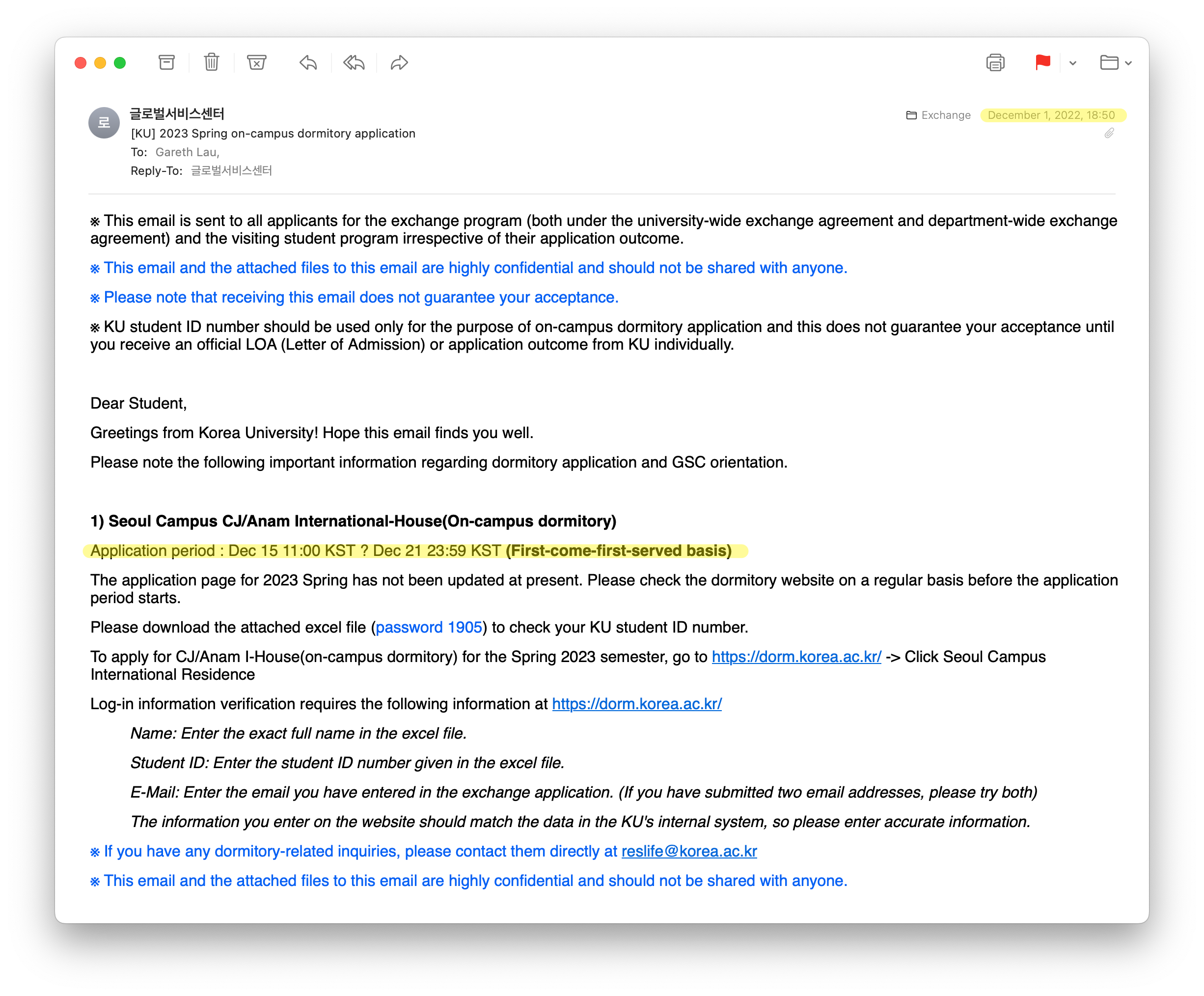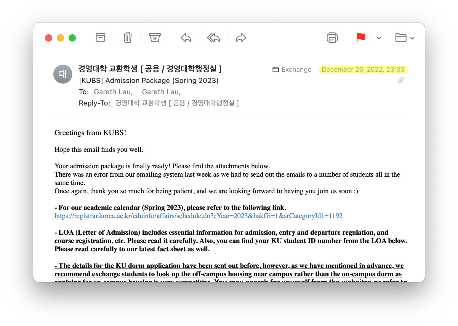 The visa you will apply for is the D-2-6 visa. You won't be able to start the process until you have received the admission package from Korea University because the application requires documents like a certificate of enrolment and business license. During my exchange year, I received the admission package on December 26th, 2022.